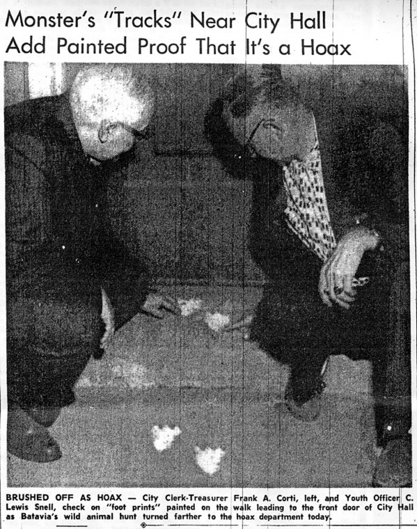 Batavia’s civic headquarters had had a visitor overnight, but it was not a miniature monster, but a prankster armed with a paint brush and a can of white paint. The alleged footprints had all clearly been painted on the sidewalk.
